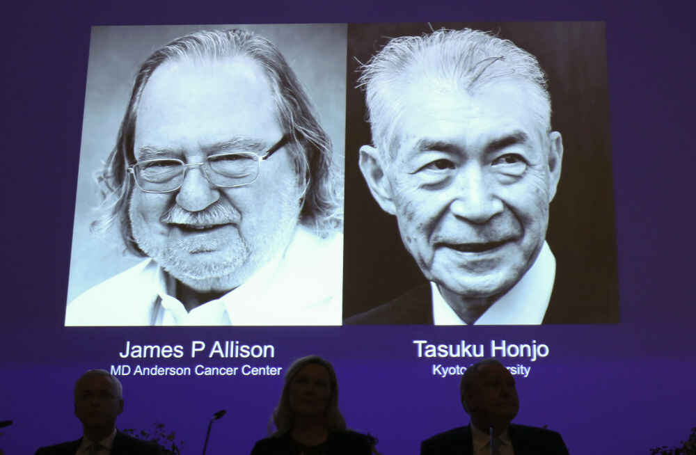 图为2018年10月1日,在瑞典斯德哥尔摩卡罗琳医学院举行的新闻发布会现场,大屏幕显示美国科学家詹姆斯·艾利森(左)和日本科学家本庶佑的照片。(新华社记者叶平凡摄)