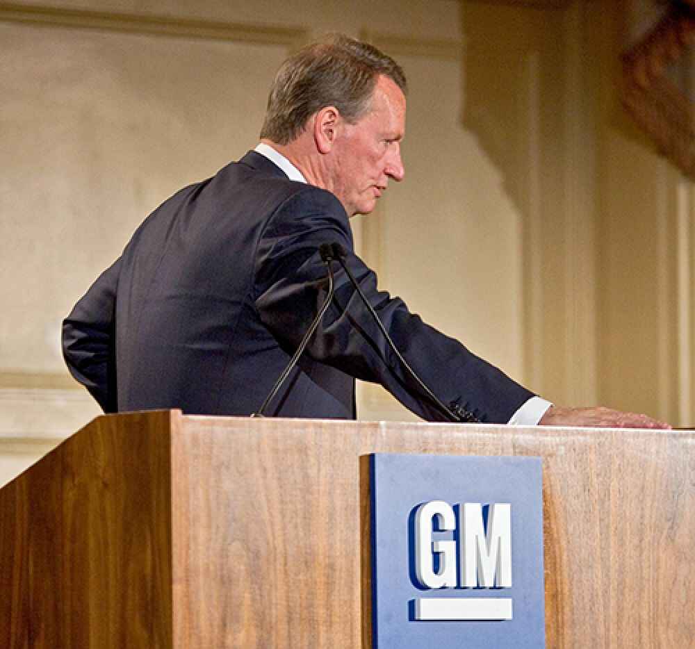 图为2008年6月3日,通用汽车董事长兼首席执行官里克·瓦格纳宣布关闭包括简斯维尔在内的四家工厂