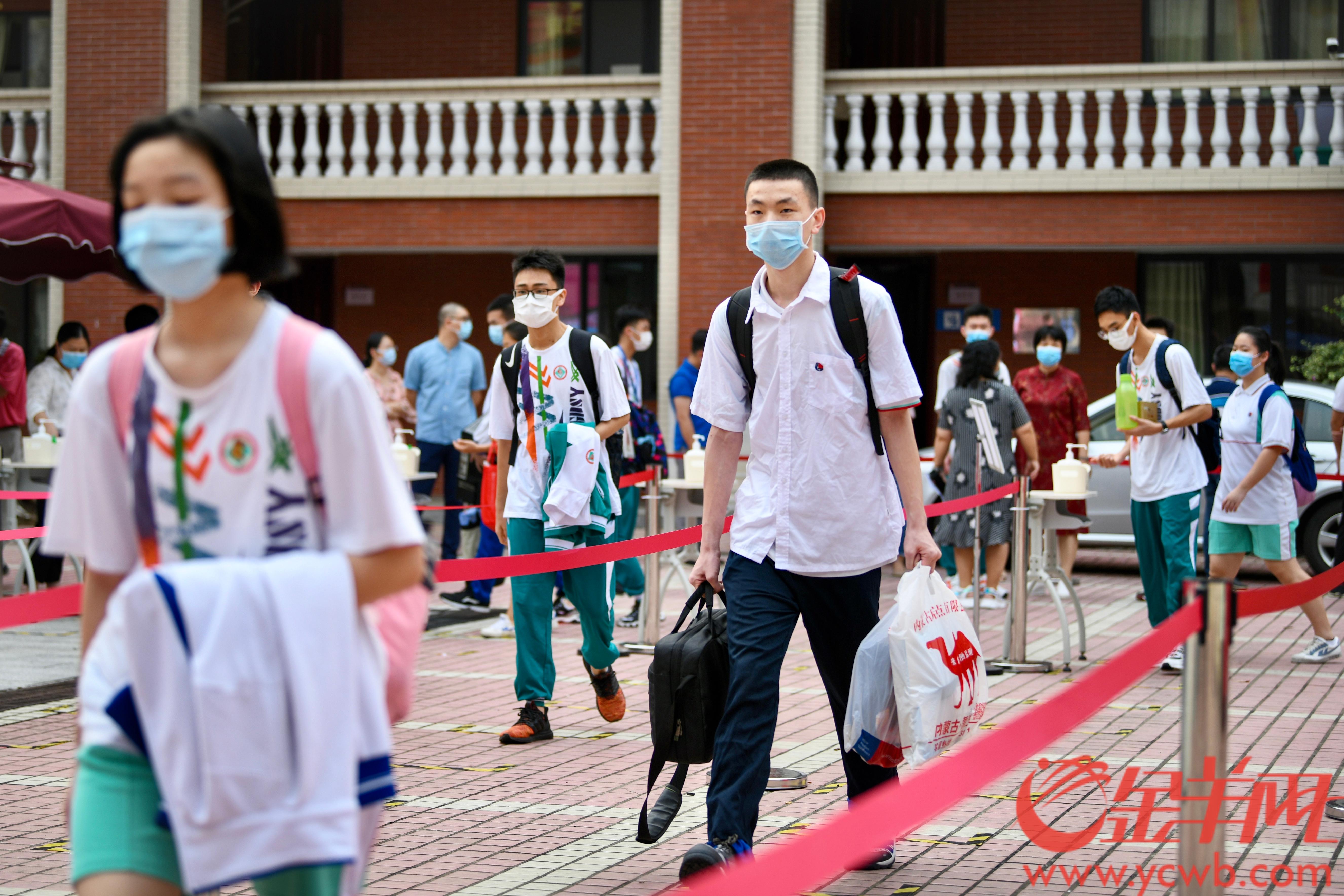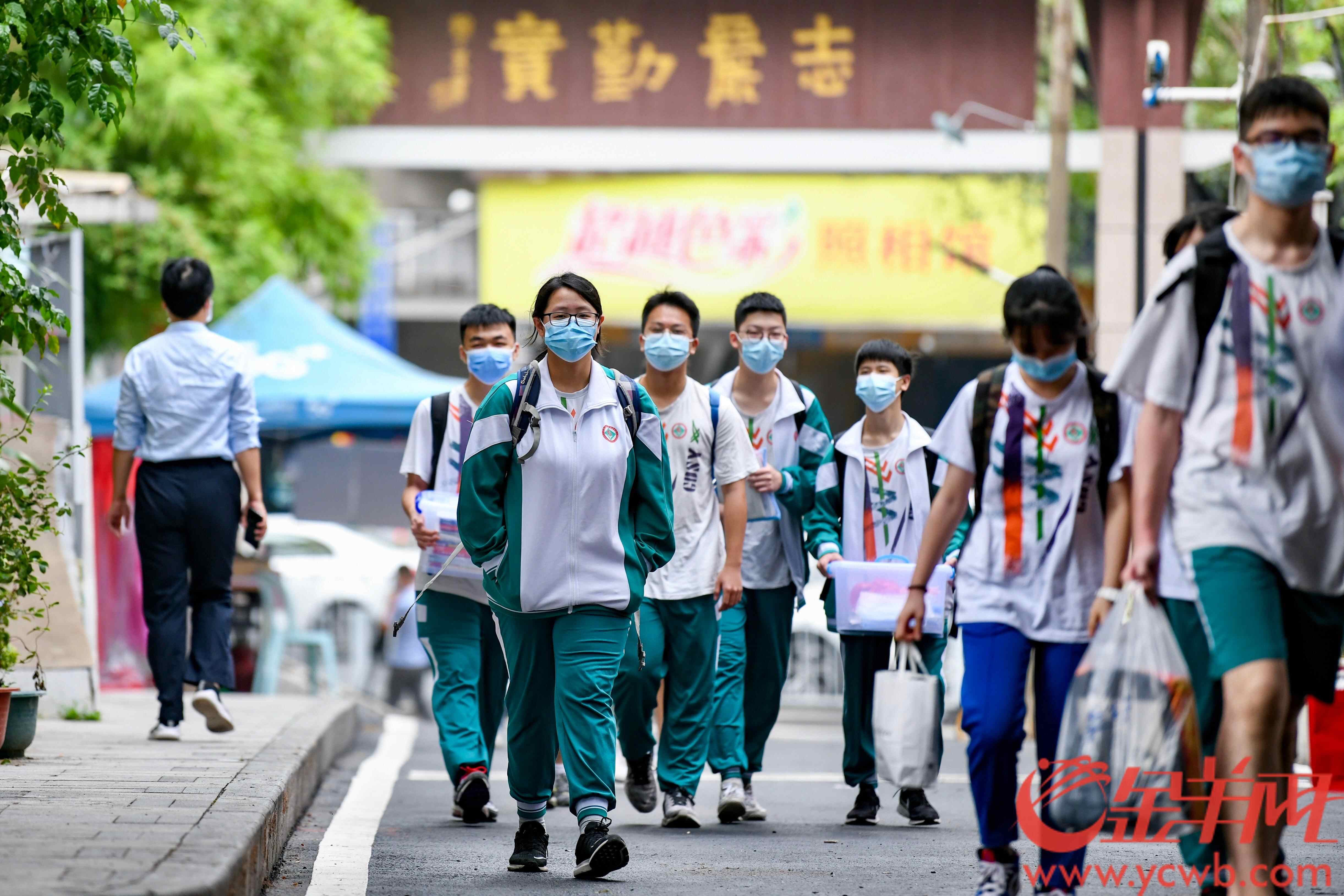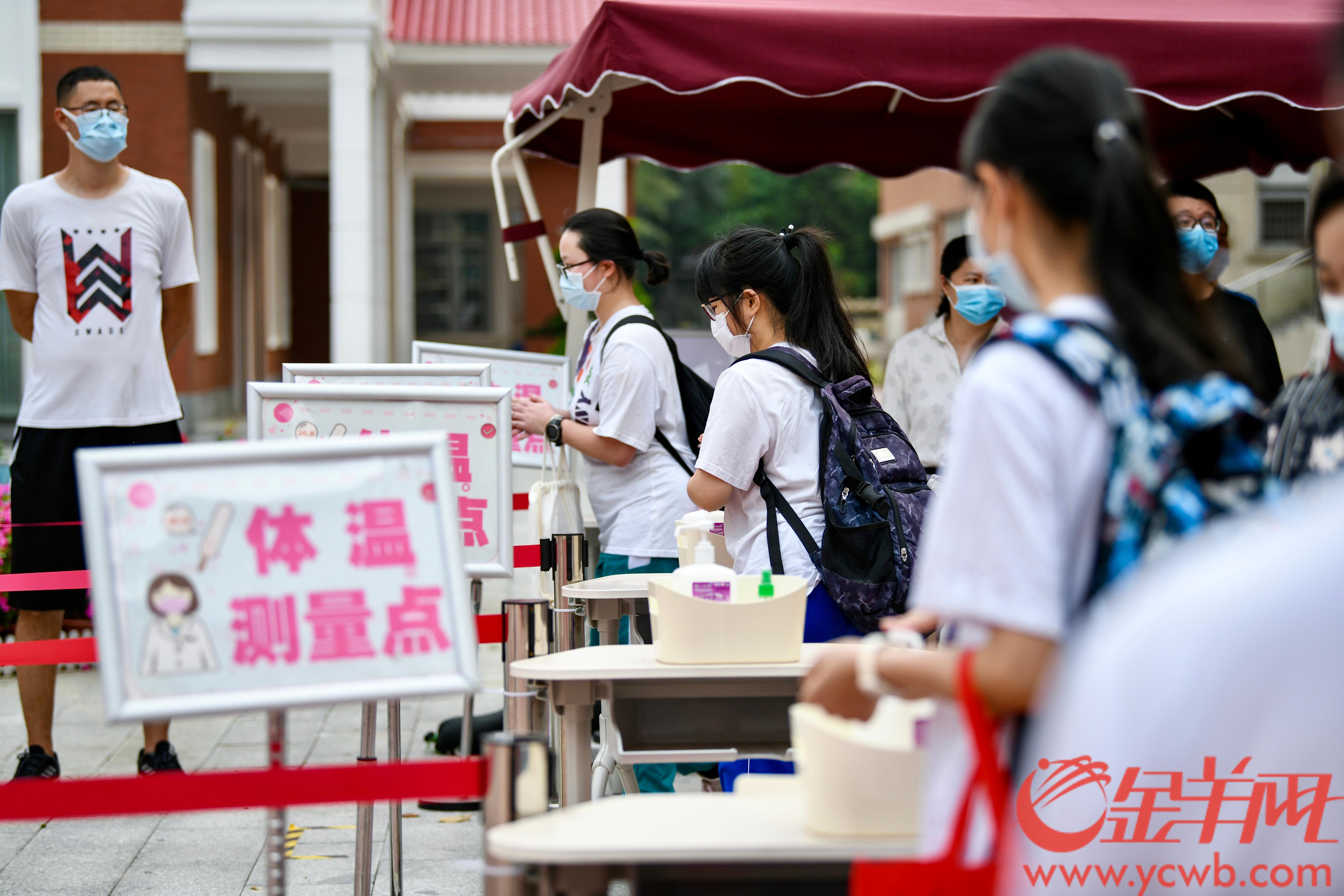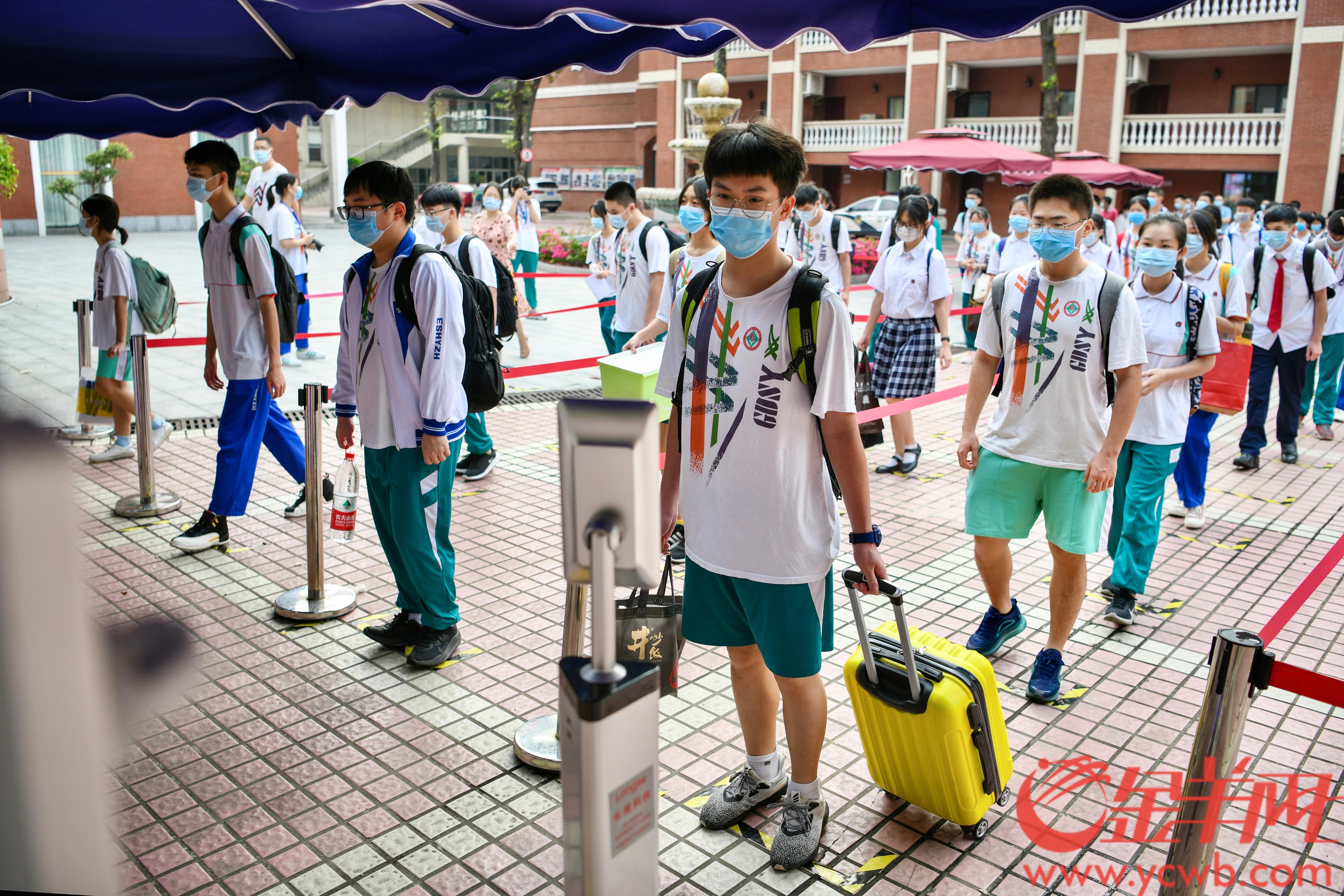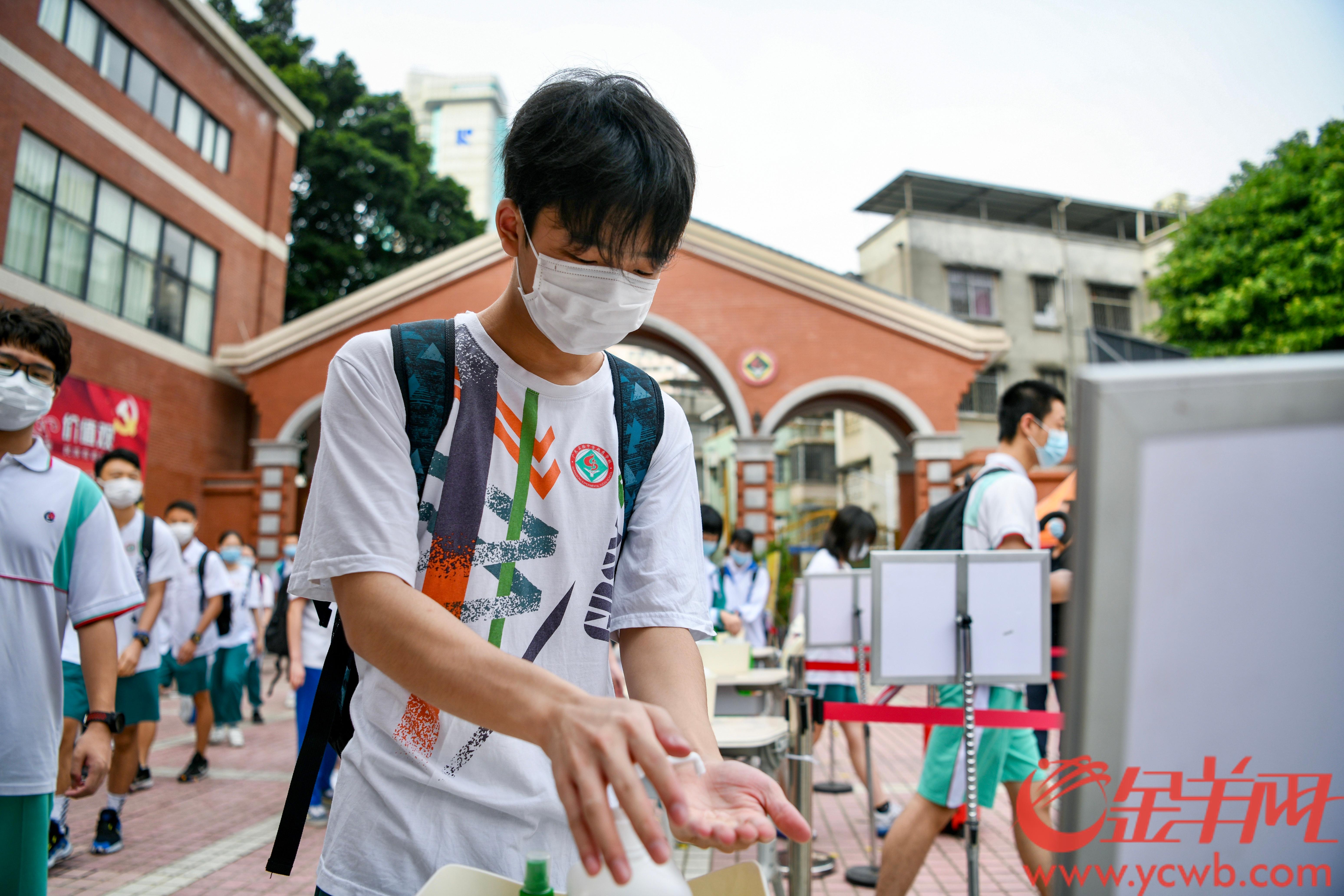 5月11日广东约1万所学校的550万师生重返校园,涉及小学四五六、初一初二、高一高二等多个年级。图为广东实验中学越秀学校入学现场,学生们洗手测体温保持距离有序进入学校 羊城晚报全媒体记者 梁喻 摄