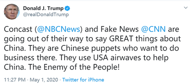 5月1日,特朗普在社交媒体上指责美国哥伦比亚广播公司(CBS)与美国有线电视新闻网(CNN)的报道是“假新闻”,并称其为“中国傀儡”“人民公敌”。而这几家媒体则多次通过刊文和电视节目的方式指责特朗普抗疫不力,推诿责任。双方互不示弱,火药味甚浓。
