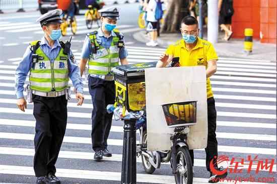 历史数据显示,去年广东省涉及摩托车、电动自行车的交通事故死亡人数占全部事故的比例超过50%,居各类交通事故之首。外卖骑手是骑乘电动车频率较高的群体之一。为了保证其安全,广东省公安厅交管局还于当天在广州举办了“一盔一带 安全常在”警企联合劝导外卖骑手佩戴安全头盔活动启动仪式,通过与相关外卖配送企业联合共治,用企业内部管理规定加强对骑手的约束。“对未戴头盔的骑手进行现场教育后,我们还会将骑手信息通报给相关企业,由企业进行内部管理和处罚。”广州市公安局交警支队越秀大队许警官表示,如果骑手在一定时期内多次未戴头盔,交管部门将会督促企业取消其配送资格。