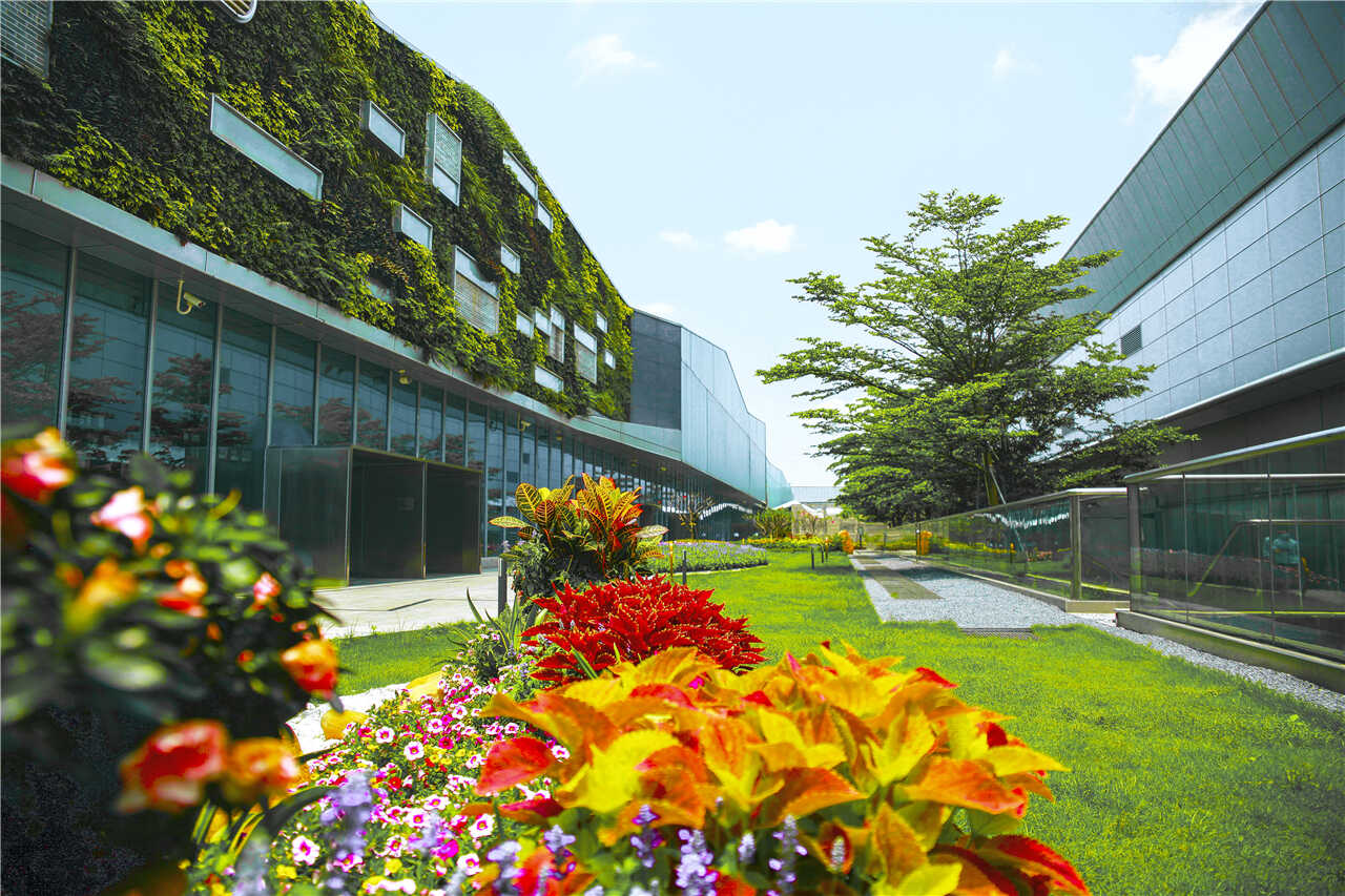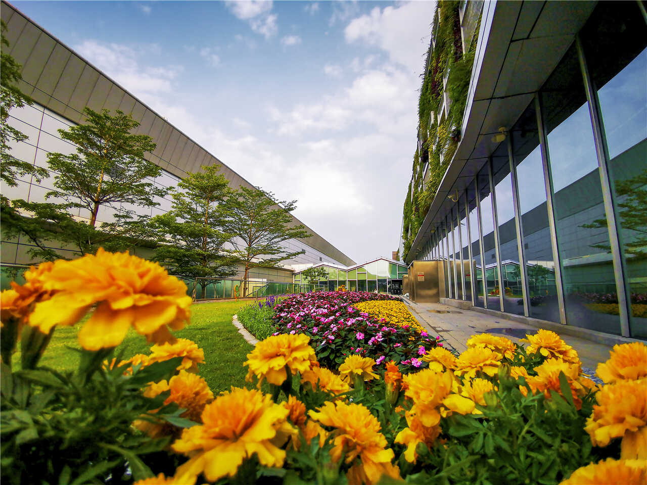 “空中花园”上方墙面点缀着一条由绿植组成的巨型绿墙,花园旁绿树成荫衬托着花卉,“幽香四溢满庭芳,淡雅素颜胜浓妆”。漫步“空中花园”仿佛置身于恬美园林,形成一种怡然自得的景象。