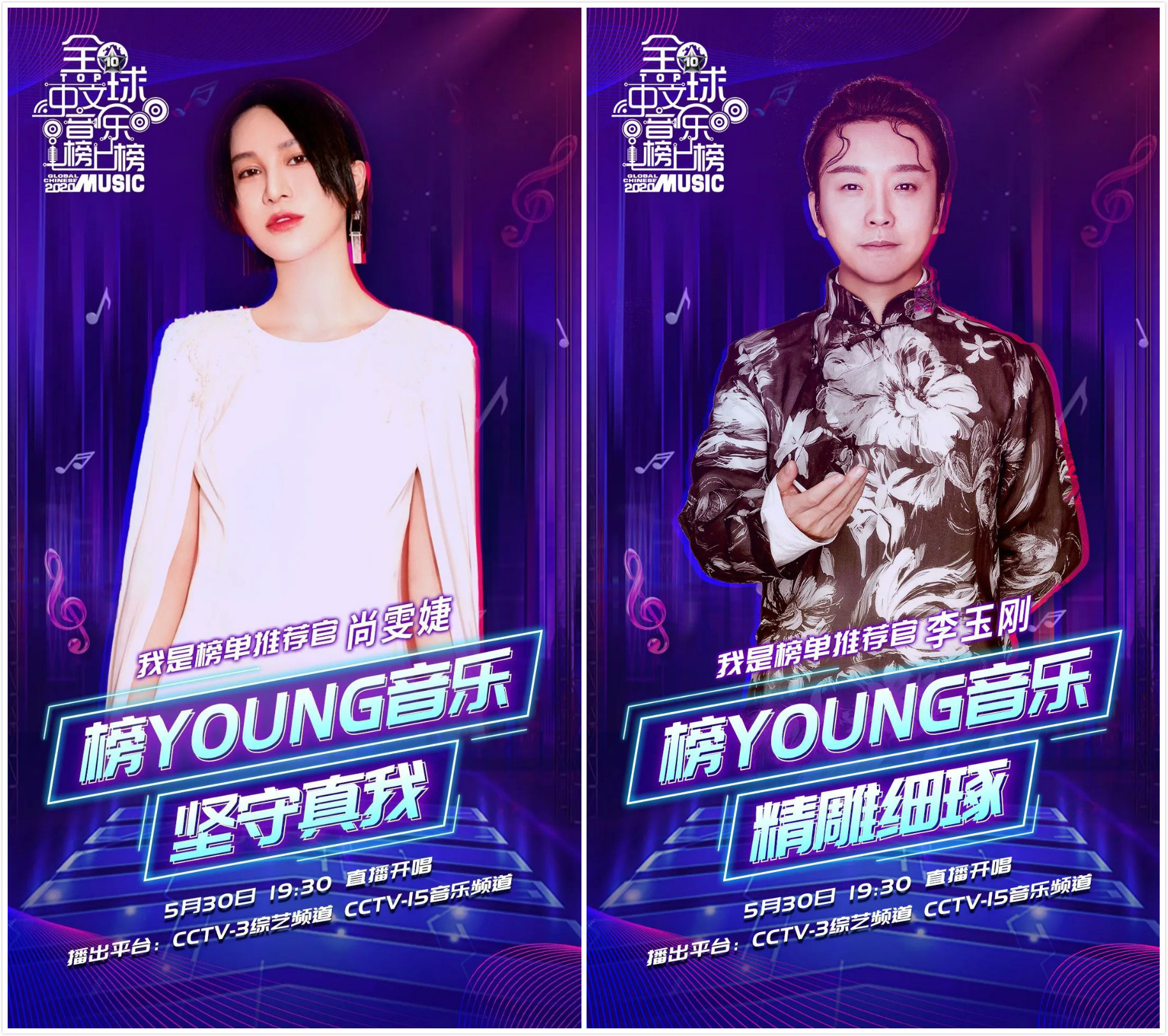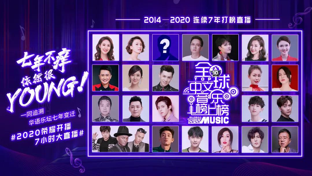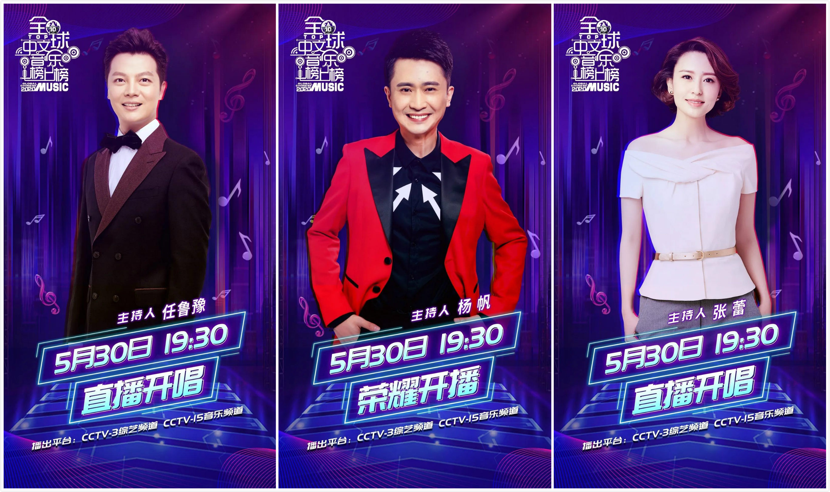 19:30分央视综艺频道CCTV-3、央视音乐频道CCTV-15并机直播,任鲁豫、杨帆、张蕾、张宇、汪聪、龙洋组成超强主持阵容,萧敬腾、林俊杰、尚雯婕、李玉刚四位“榜单推荐官”荣耀来袭。
