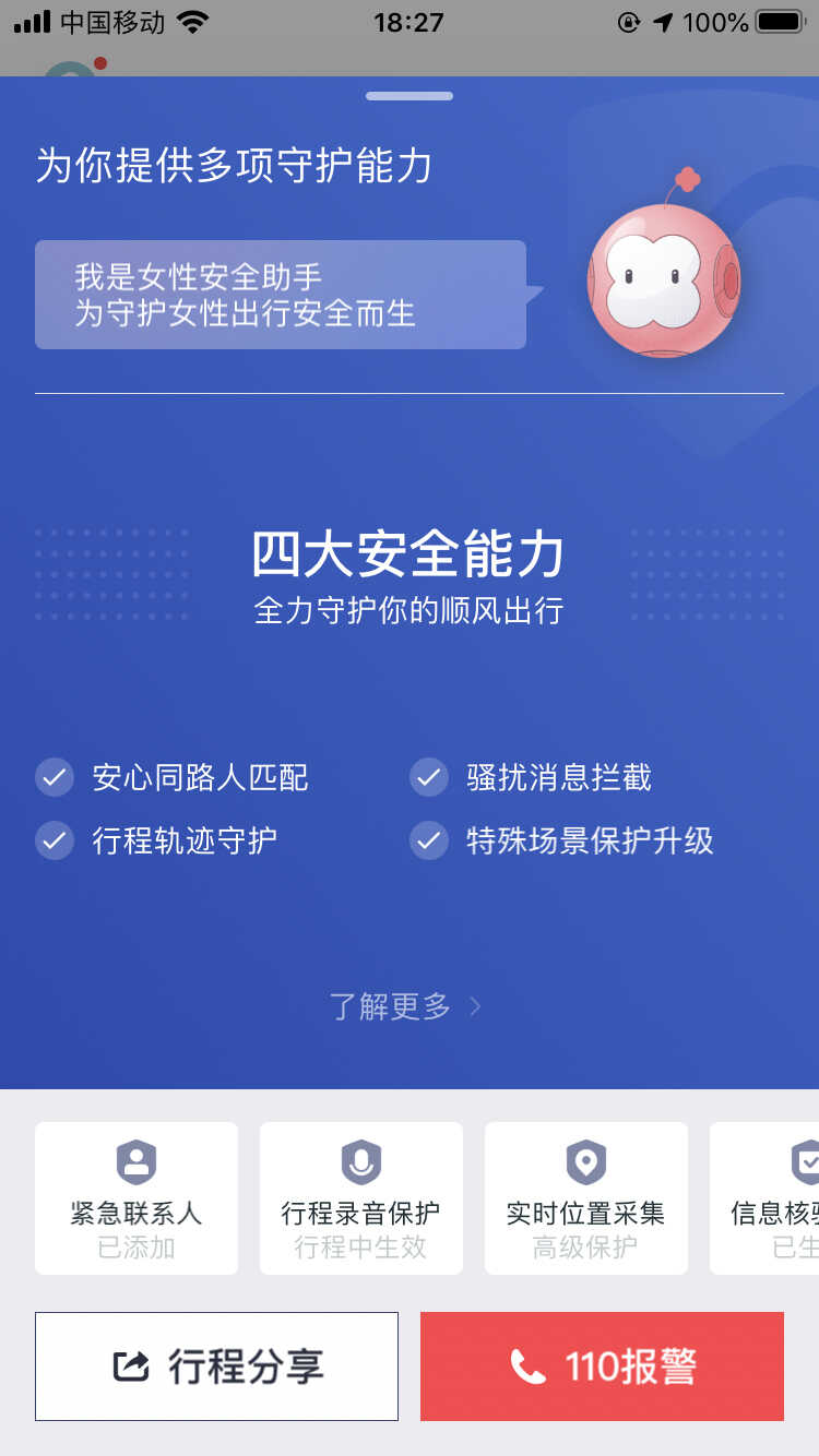 在行程发布页面上,滴滴顺风车增设了“女性安全助手”,可以点击“110报警”按钮一键报警。滴滴表示,如发生轨迹偏移、长时间停留等异常情况,“女性安全助手”会对用户预警。