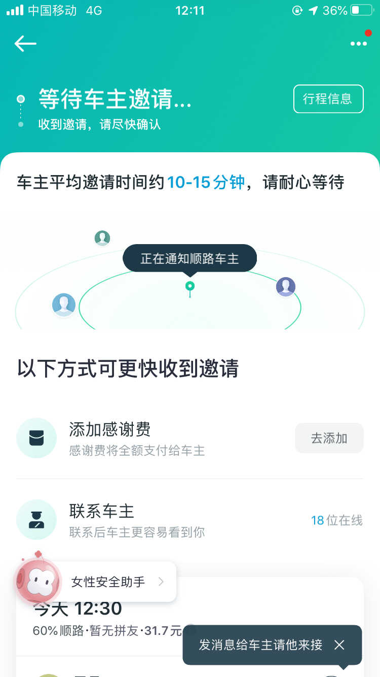 记者于12时10分在小北附近发布了一个15公里的行程,选择12时25分-12时40分出发。根据页面提示,行程发布后需等待车主邀请,确认邀请后才可出行。记者看到,当前有18位车主在线,车主平均邀请时间约10-15分钟。可直到12时40分,依然没有车主接单,此时页面提示“行程已超时”。不过在价格方面,顺风车相对于快车、拼车更便宜。起止地点相同的15公里行程,顺风车31.7元,快车估价47元、拼车一口价32.7元。