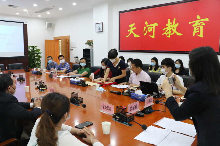 电脑派位结束后,广州市公证处对现场派位结果进行公证,此外还有人大代表、政协委员、新闻媒体、民办学校行政代表、家长代表参与派位仪式。电脑派位录取名单由天河区教育局领导现场签批并加盖公章,立刻生效,并在各校门口公布。