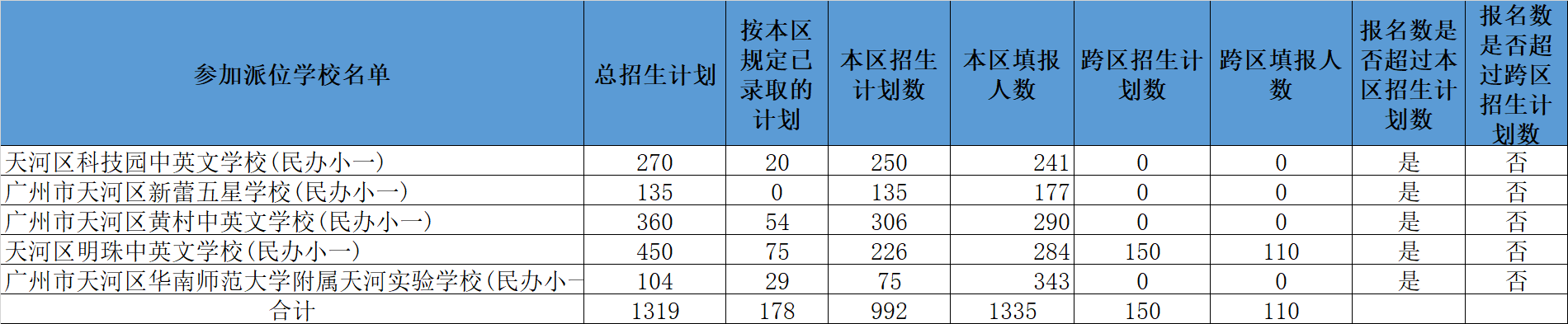 “广州市义务教育学校招生报名系统”显示,天河区科技园中英文学校、天河区新蕾五星学校、天河区黄村中英文学校、天河区明珠中英文学校、华南师范大学附属天河实验学校5间民办小学报名人数超过计划录取数。5所学校共有1335人填报,超过本区992人的招生计划,因此由天河区教育局公开实行电脑派位录取。上述5所超计划报名小学中,华南师范大学附属天河实验学校最为抢手,343个学生“抢”75个学位。