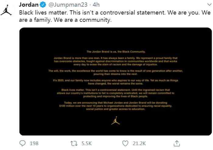 当地时间6月5日下午,乔丹品牌在社交网站“推特”上发表声明,并配文称“黑人的命也是命。这不是一个有争议的说法。我们就是你们。我们是一个家族,我们是一个社区。”