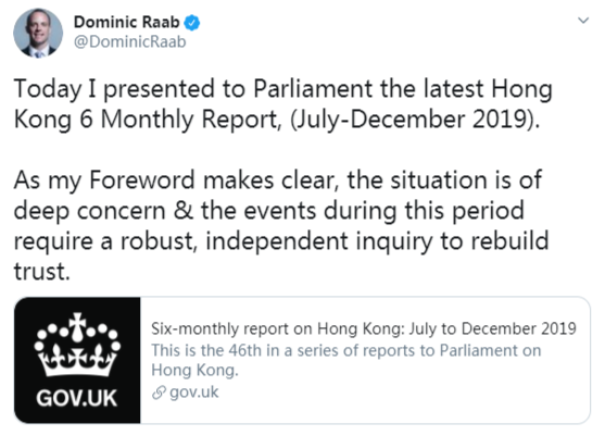 最新的报告中,英国外交大臣拉布语气强硬,再次借《中英联合声明》说事,对涉港国安立法指手画脚,甚至以接收乱港分子威胁。然而拉布仍不肯承认,中国政府治理香港的法律依据是中国宪法和香港基本法,与《中英联合声明》无关。随着1997年香港回归,声明里规定的与英国相关的条款已全部履行完毕,而里面对香港的基本方针政策都已体现在基本法中。这一切都是中国的政策宣示,而不是对英方的承诺。