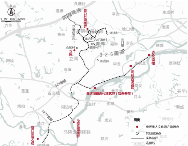 这条游径以国道G325、省道S275、县道X555、乡道Y754等车行路为连接线,串联起各个华侨文化遗产集聚区,集中展示中西合璧的碉楼建筑群和侨乡聚落。该段实体游径长约4公里。