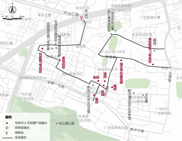 如今,依托广州市绿道、庙前西街、启明横马路、东华东路、培正路、烟墩路、保安前街等步行品质较好、风貌特色明显的城市支路、骑楼街串联起华侨华人文化遗产资源点,展示归侨、侨领集中生活的社区。该段实体游径长约3.2公里。