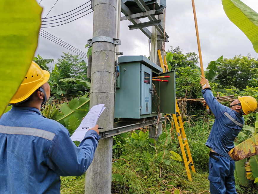 14日上午,在阳江的荣仔村里,阳江阳春供电局陂面供电所运维人员正戴着绝缘手套,拿着绝缘棒对荣仔公变的避雷器进行更换。在收到线路停电信息后,陂面供电所立马组织人员对线路进行故障排查,发现原来是该台区的避雷器在雷雨袭击下已被击穿。中午时分,荣仔村受影响的89户用户就恢复了用电。