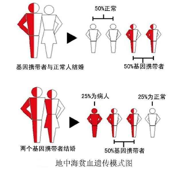 父母双方若为同类型轻型地贫(即地贫基因携带者),他们所孕育的胎儿中有1/4是正常胎儿、1/2是轻型地贫(同父母一样)、1/4的会是中重度地贫患者(预防重点)。