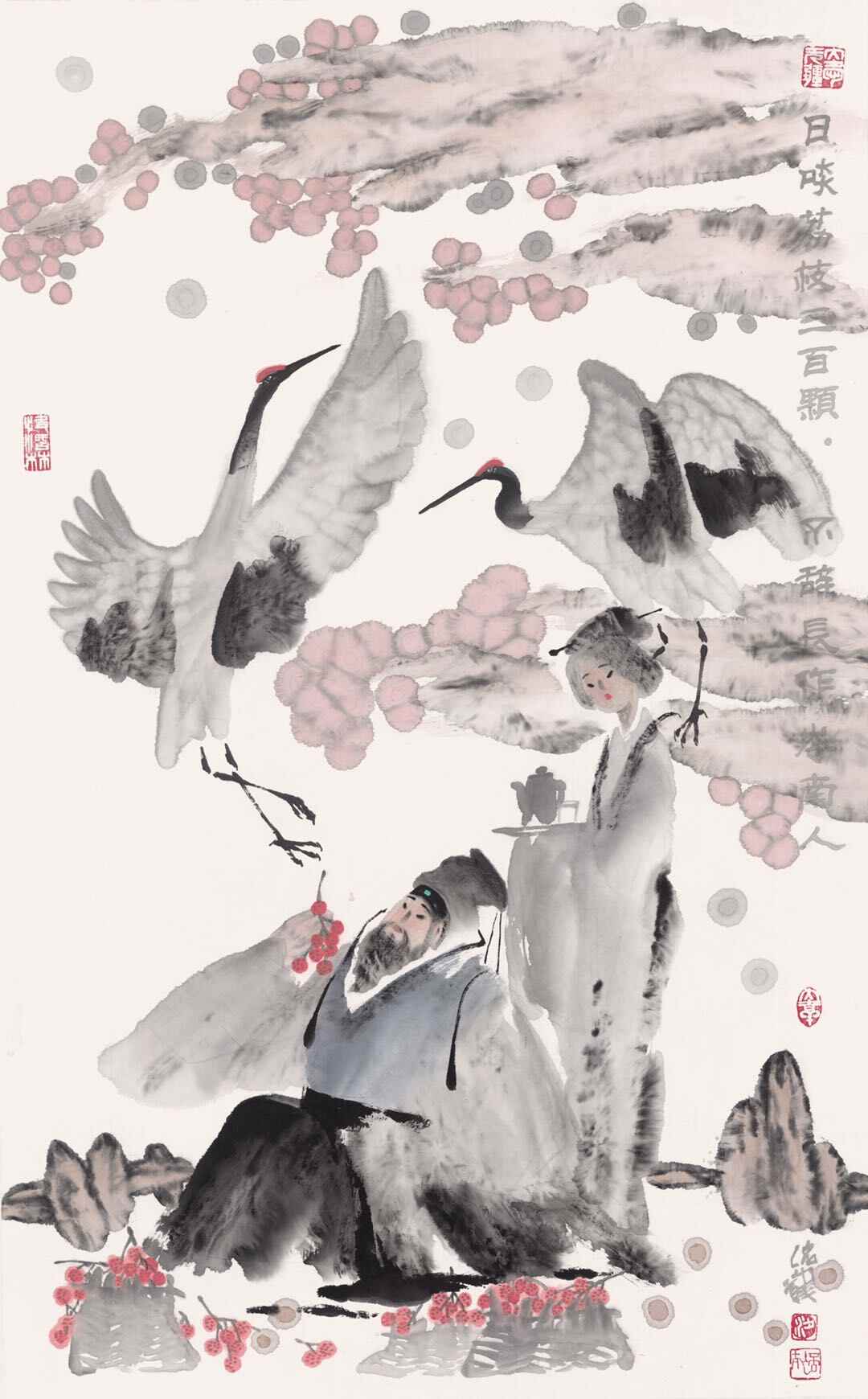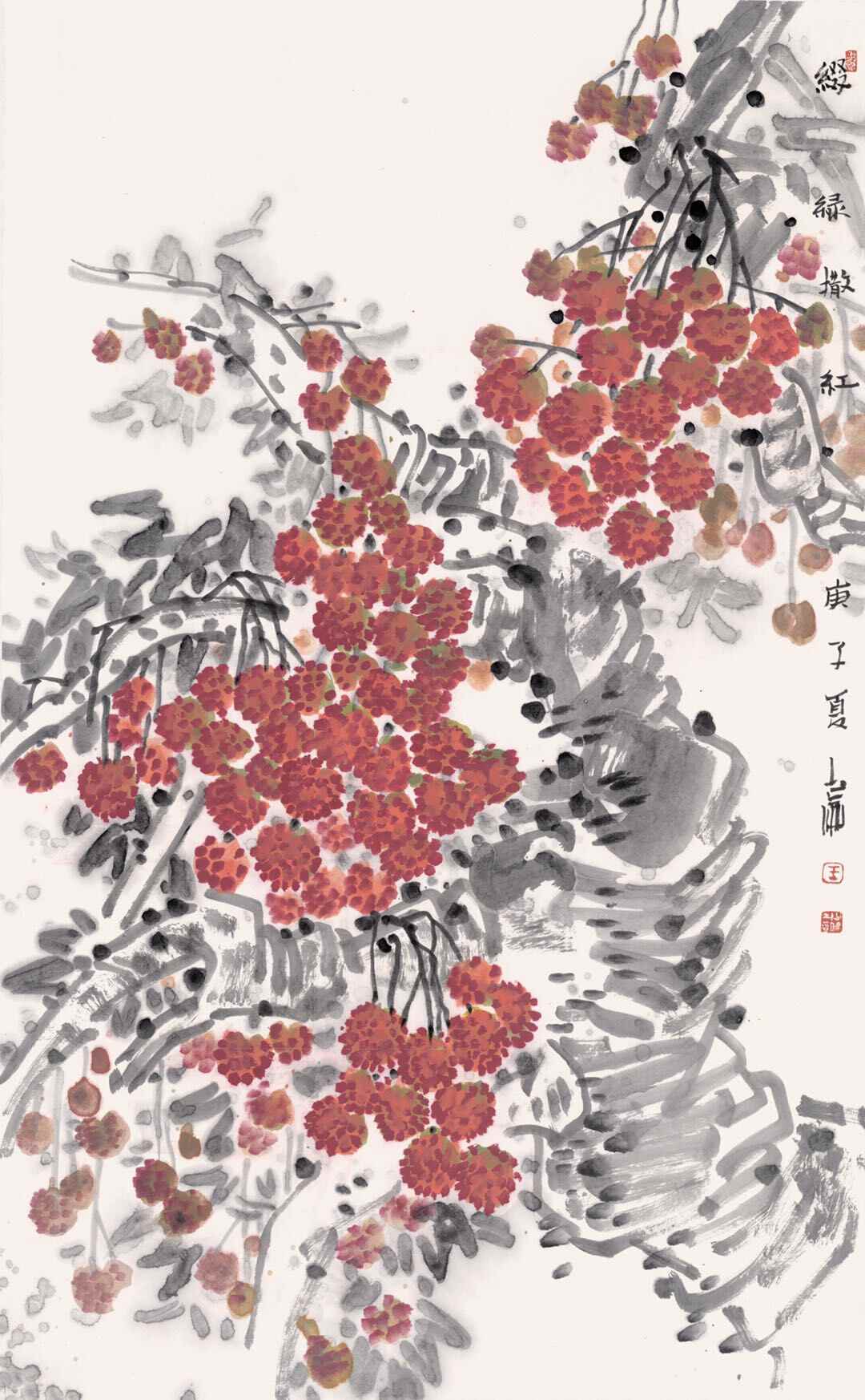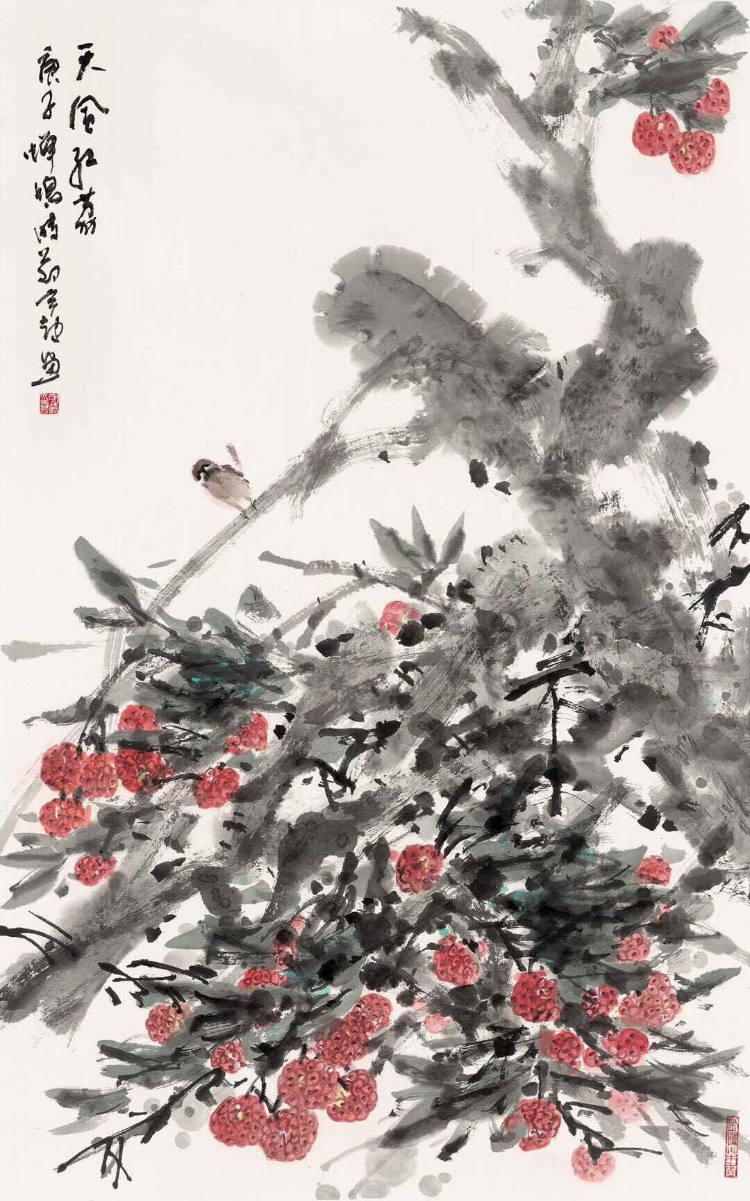60位老中青画家,从不角度表现了荔枝的形象以及象征语言。这六十位画家,有上至九十一岁高龄的岭南国画泰斗陈金章先生,有下至二十多岁的青年画家,比较全面。60幅作品表面上看是花鸟题材,但其实突破了花鸟的范畴,包括山水、人物,譬如莫肇生的《山中新雨红荔艳》山水、梁培龙的《东坡食荔图》人物。