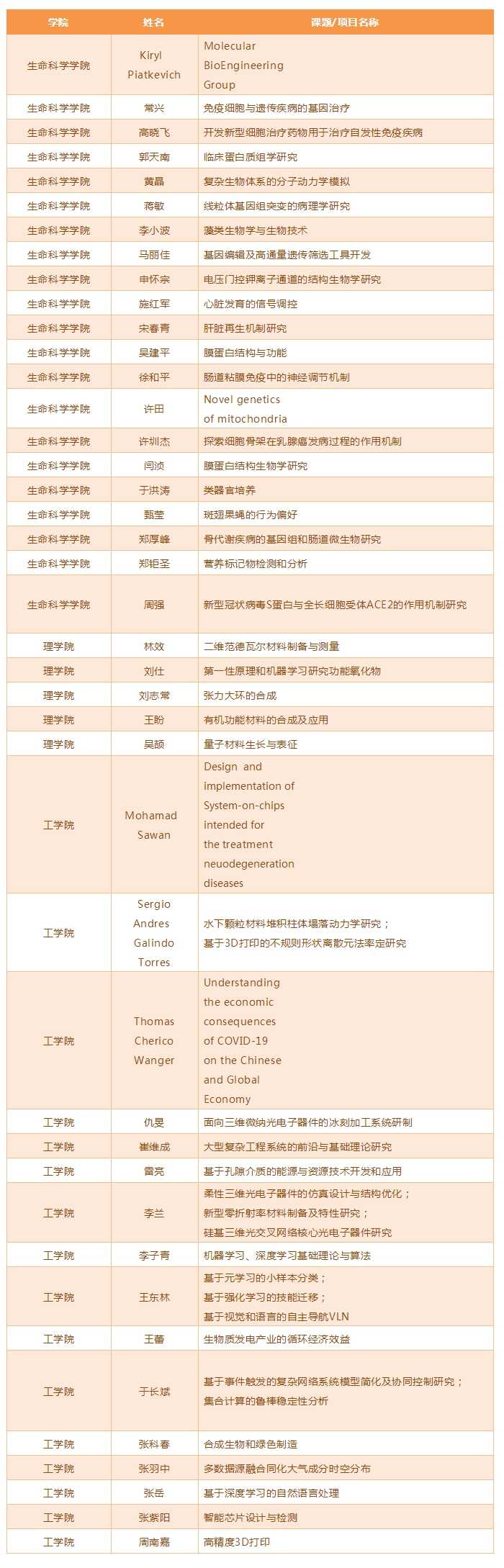 西湖大学暑期科研实习项目一览表