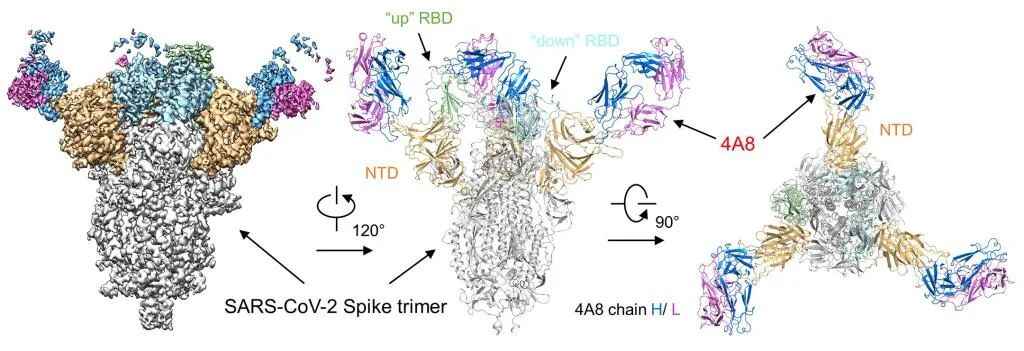 周强团队解析的新冠病毒S蛋白与单克隆抗体4A8复合物的冷冻电镜密度图(左)及结构图