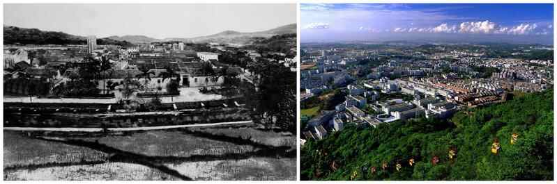 左图:改革开放前,南岭村旧貌;右图:2013年的南岭村。