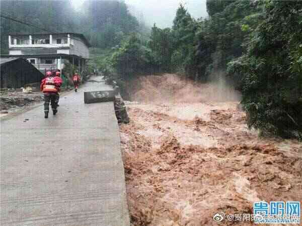 6月30日至7月1日,贵州省桐梓县受强降雨影响导致山洪暴发,洪水冲垮房屋、堤坝、电路、通讯等,上万人受困。