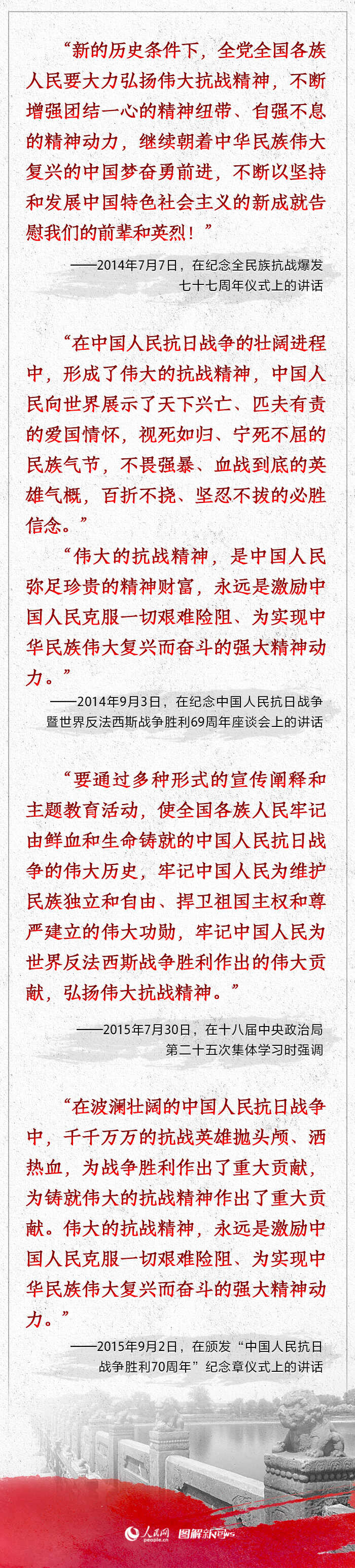 “前事不忘,后事之师。”十八大以来,习近平总书记在多个重要场合就中国人民抗日战争作出重要论述,强调弘扬伟大的抗战精神,为民族奋进凝聚起磅礴伟力。