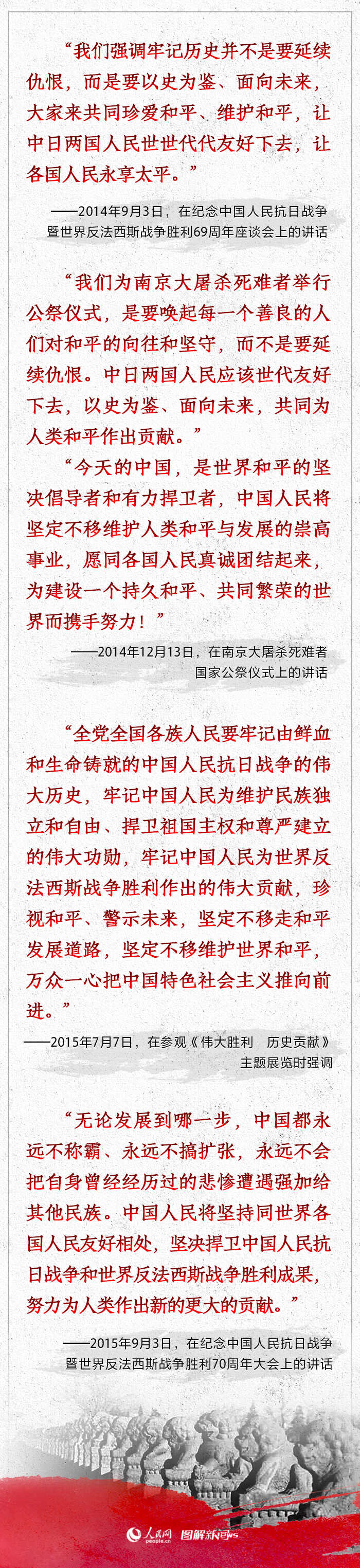 历史是最好的教科书,也是最好的清醒剂。习近平在关于中国人民抗日战争的重要讲话中多次强调要铭记历史、珍爱和平,展示了中国以史为鉴,坚定不移走和平发展道路,坚定不移维护世界和平的决心。