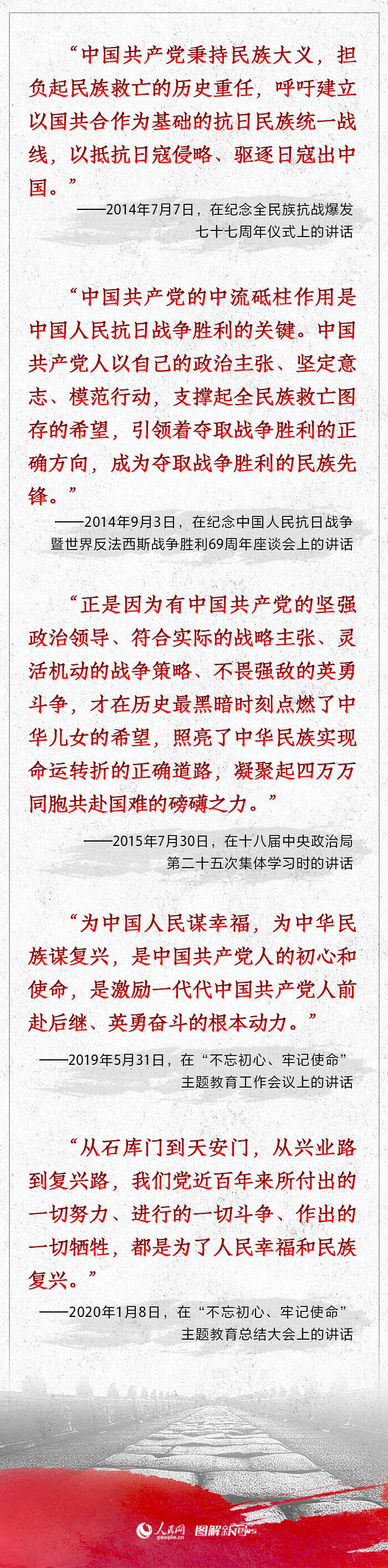 十八大以来,习近平多次深刻剖析中国人民抗日战争胜利原因。在其中,习近平指出,中国共产党的中流砥柱作用是中国人民抗日战争胜利的关键。