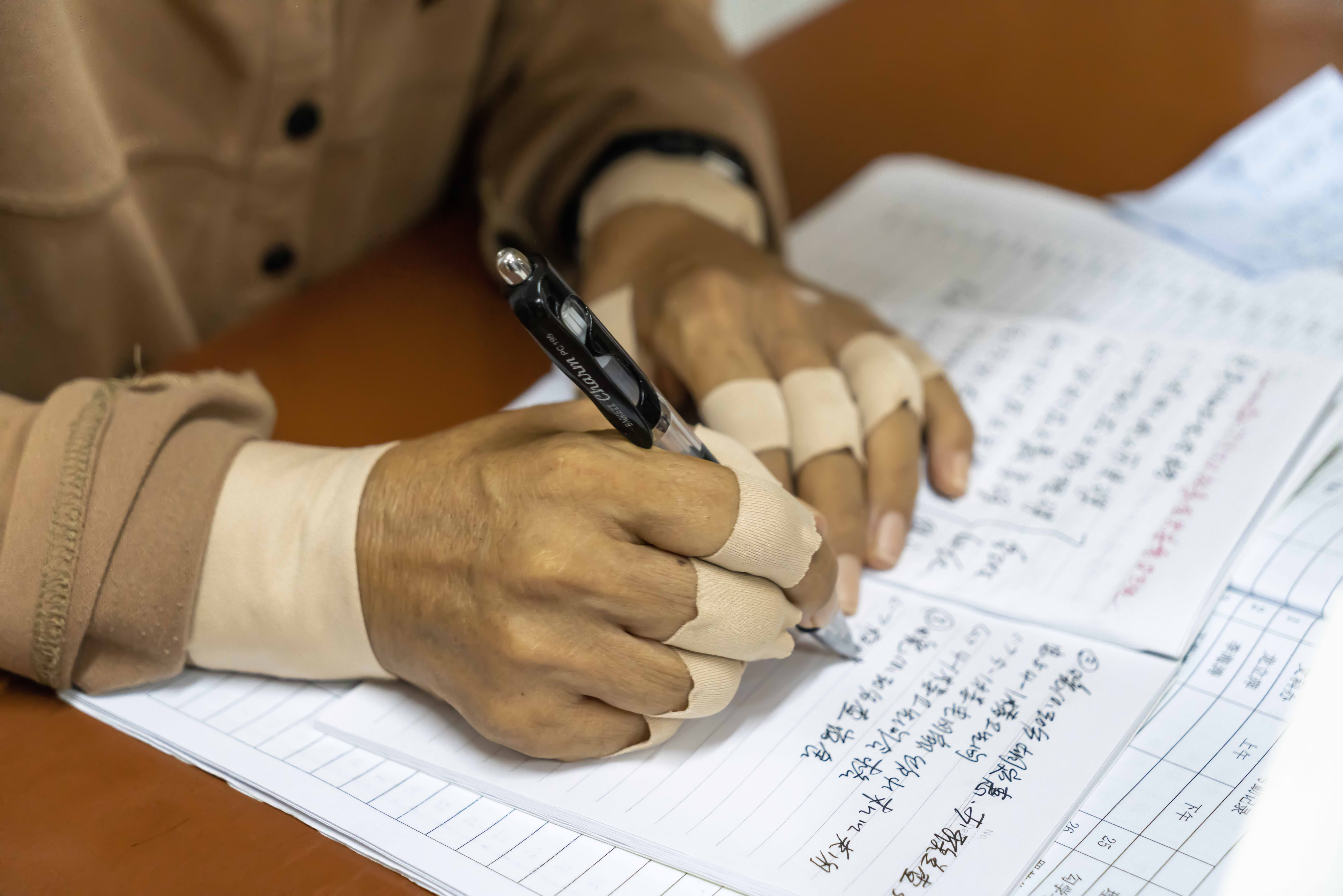 ↑张桂梅在办公室里填写教学楼巡查记录(7月4日摄)。