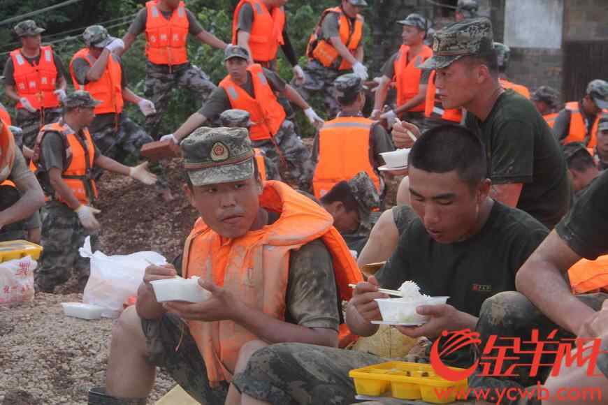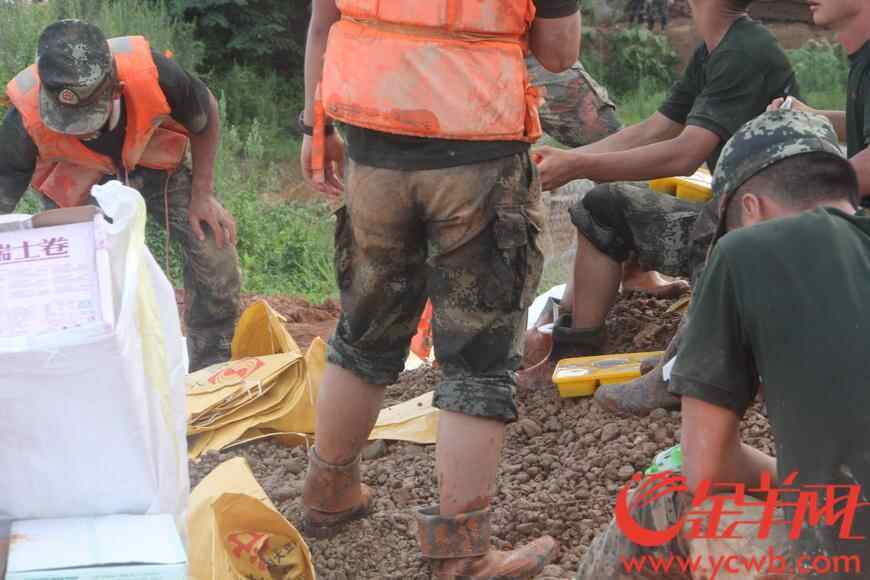 而在旁边的另一段河堤,来自72军某旅和江西武警总队机动支队的官兵则连夜对堤坝进行加固工作。来自江苏的20岁战士耿建豪浑身湿透,高筒雨鞋里全是泥水。