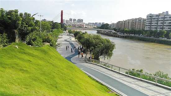 江门河畔的城央绿廊已成市民休闲好去处