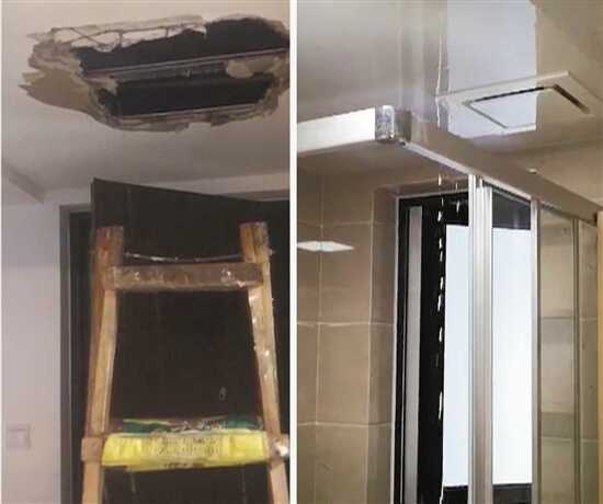 暴雨似的漏水究竟是什么原因引起的?广州鸿力公司的工程师在查看现场后表示,卫生间漏水,与主管道没封堵好有很大关系。