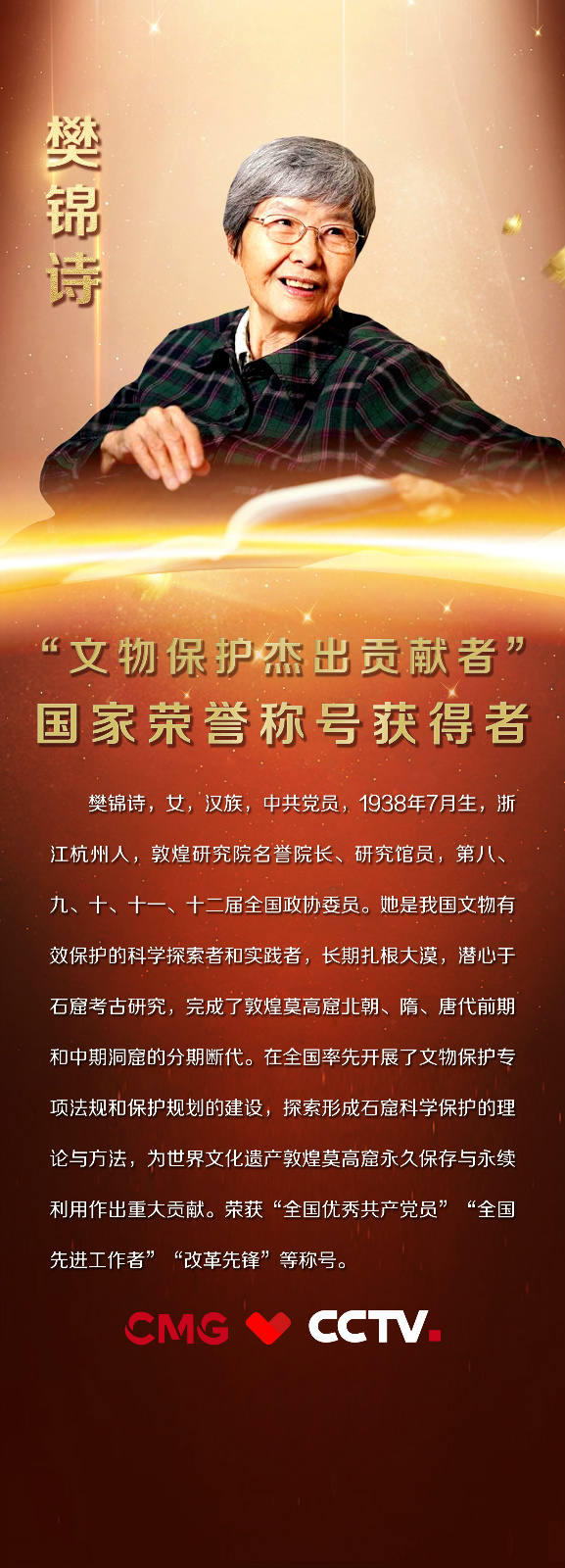 樊锦诗,女,汉族,中共党员,1938年7月生,浙江杭州人,敦煌研究院名誉院长、研究馆员,第八、九、十、十一、十二届全国政协委员。她是我国文物有效保护的科学探索者和实践者,长期扎根大漠,潜心石窟考古研究,完成了敦煌莫高窟北朝、隋、唐代前期和中期洞窟的分期断代。在全国率先开展文物保护专项法规和保护规划建设,探索形成石窟科学保护的理论与方法,为世界文化遗产敦煌莫高窟永久保存与永续利用作出重大贡献。荣获“全国优秀共产党员”“全国先进工作者”“改革先锋”等称号。