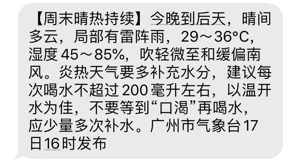 比常年偏少六成的降雨,可能创纪录的“空台”,让“水”弥足珍贵。广东省和广州市气象台,在天气预报中均提示“天气炎热,需注意防暑防晒并适时补水”。广州市气象台更在7月17日晚间天气预报中建议,市民每次喝水不超过200毫升,建议以喝温开水为佳,不要等到“口渴”再喝水,应少量多次补水。