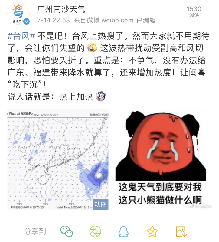 因“盼风风不至”,“台风”一词一度在7月14日登上新浪微博热搜。