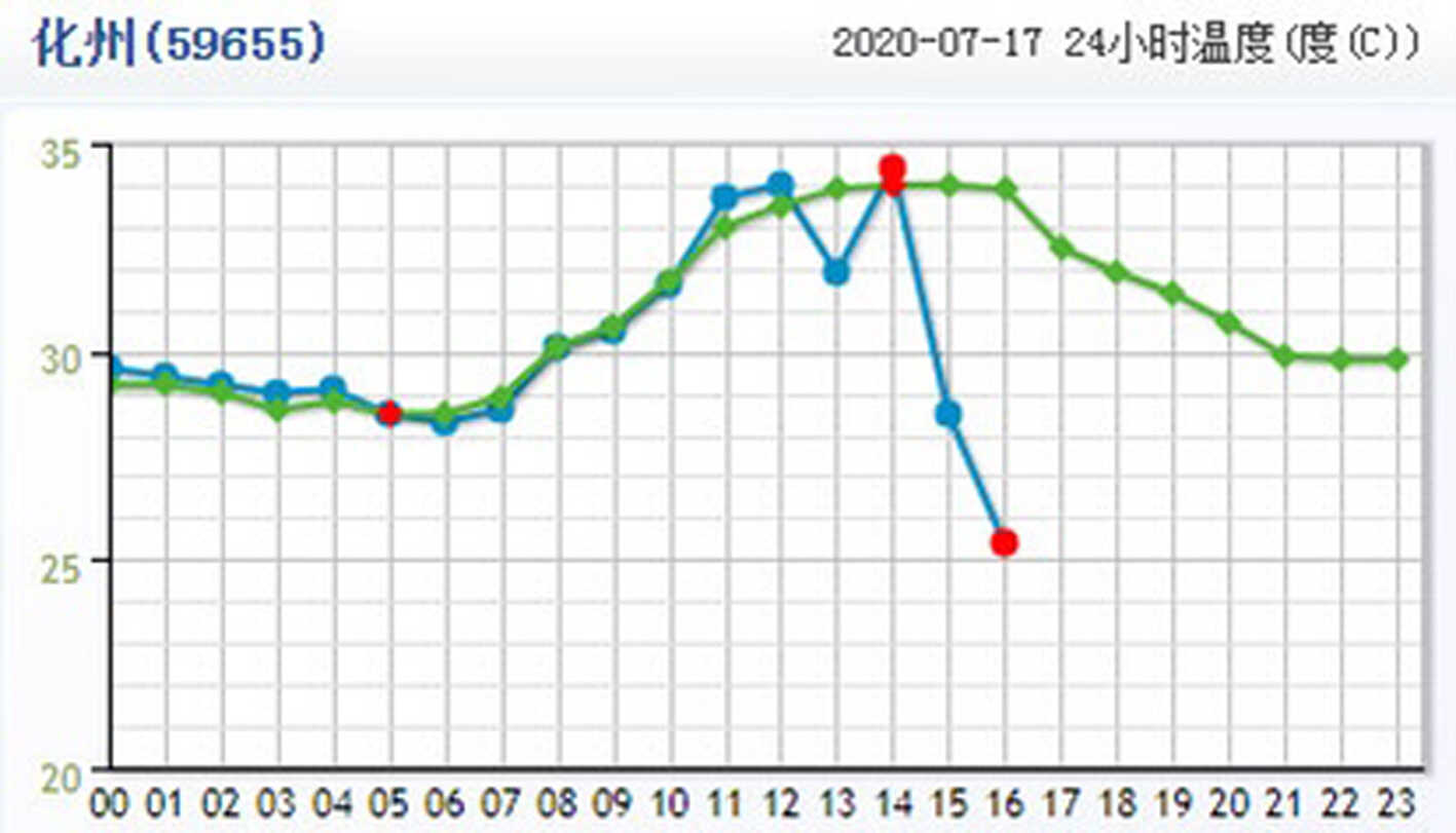 “台风胚胎”不幸“难产夭折”,老天爷“给点面子”般让广东下了些“及时雨”。广东省气象台观测发现,7月17日广东不少地方出现午后阵雨,顺德、信宜、化州等地市区,连同广州的番禺、南沙、增城等区,一度发出雷雨大风黄色预警。化州7月17日14时至16时,气温一度因降雨从34℃下降至26℃,信宜13时至15时气温也从33℃下降到25℃。