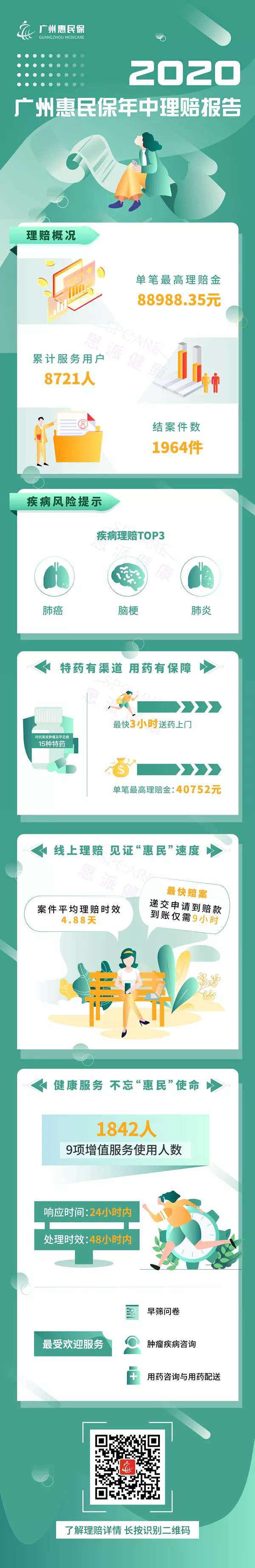 日前,普惠型重特大疾病补充医疗保险—“广州惠民保”官方发布2020上半年理赔数据报告”。报告显示,上半年广州惠民保累积服务用户8721人次,理赔结案数1964件,单笔最高理赔金额达到88988.35元。
