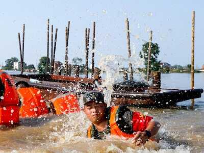 庐江县境内的巢湖支流白石天河当前大部分埂头已与河水持平。同大镇南闸段因水压过大,河堤出现松软、渗漏险情,同大圩内的十万亩农田和人民群众的生命财产受到严重的洪灾威胁。第71集团军“太行劲旅”近千名官兵火速驰援出险河段,同地方抢险力量一起利用大型机械沿河岸植桩、填放沙袋、垒高河堤,确保大堤内同大圩的安全度汛。左学长/人民图片