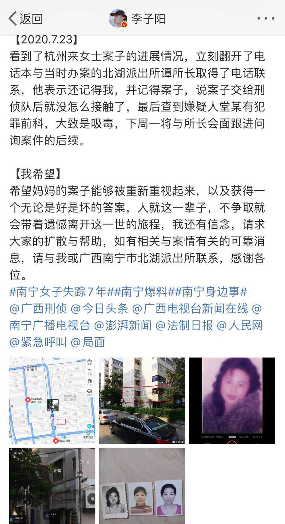 2020年7月24日,李子阳忍不住发微博,回忆母亲八年前离奇失踪的关键细节。在微博中,他写道,母亲的身份证、银行卡、手机都没带,人至今杳无音信。