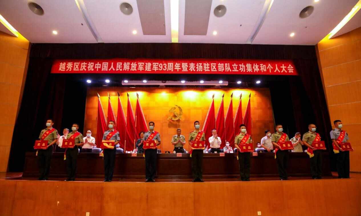 7月30日,广州市越秀区召开“庆祝中国人民解放军建军93周年暨表扬驻区部队立功集体和个人大会”,军地领导为16个驻区部队大单位10个集体、162名个人立功代表及4名援鄂部队功臣颁奖并留影,鼓励部队官兵聚焦备战练兵、提升军事本领,推动军地建设再上新水平。