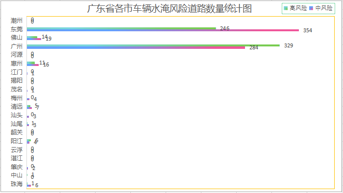 广东省各市车辆水淹风险道路数量统计图示