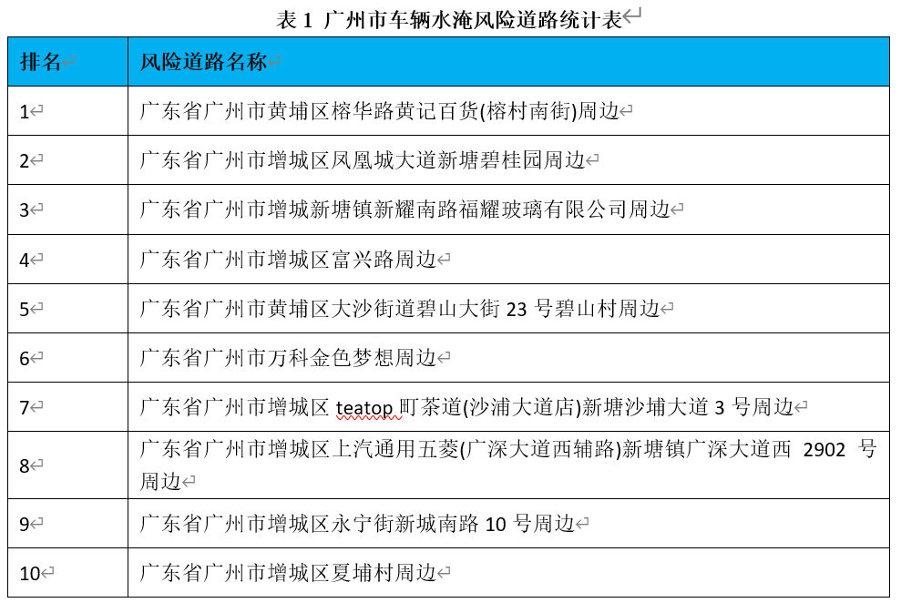 广州市车辆水淹风险道路统计表
