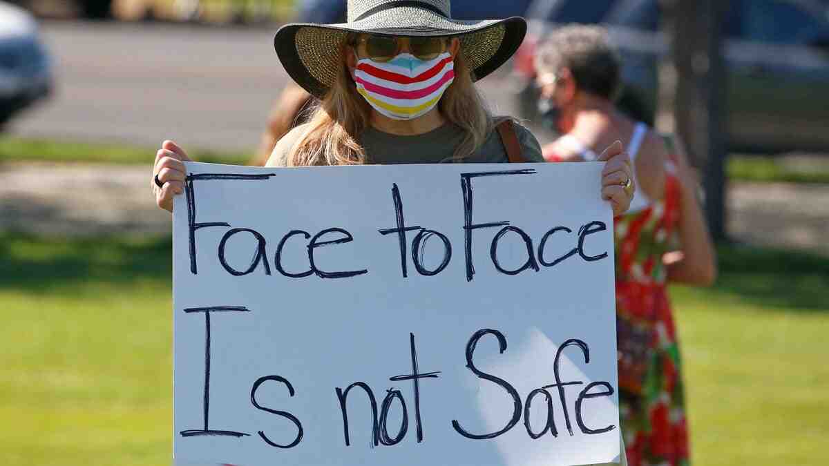 △犹他州一名小学教师举起“面对面不安全”的标语(图片来源:《今日美国报》)