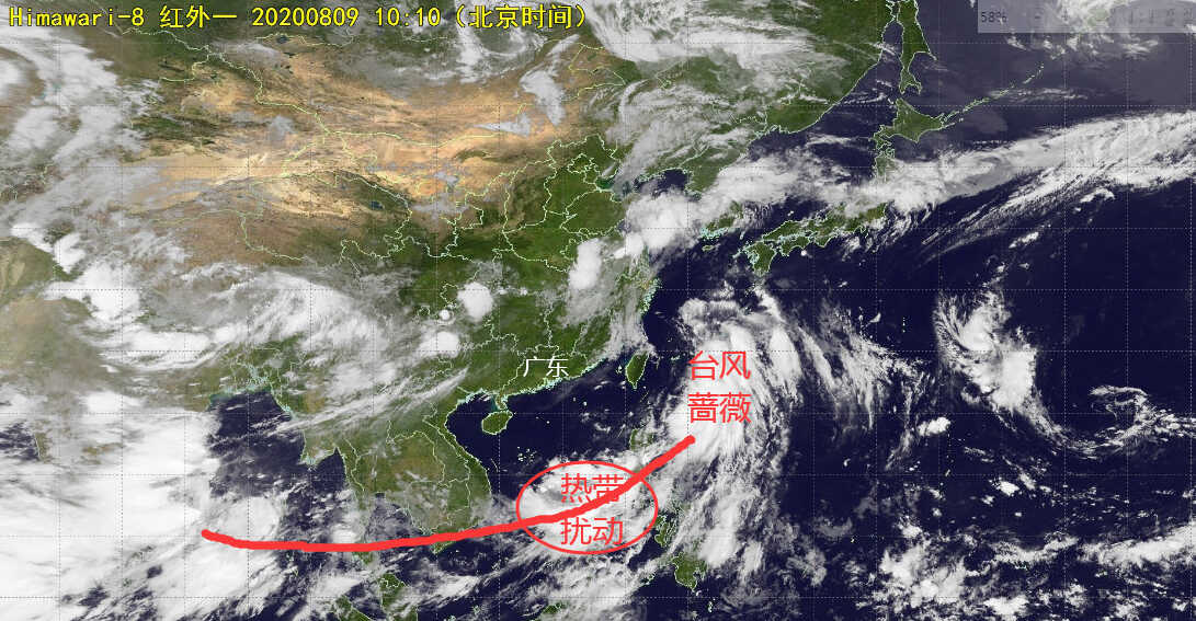8月9日上午卫星云图,可见“蔷薇”和热带扰动云团共舞 广东省气象台官方微博截图