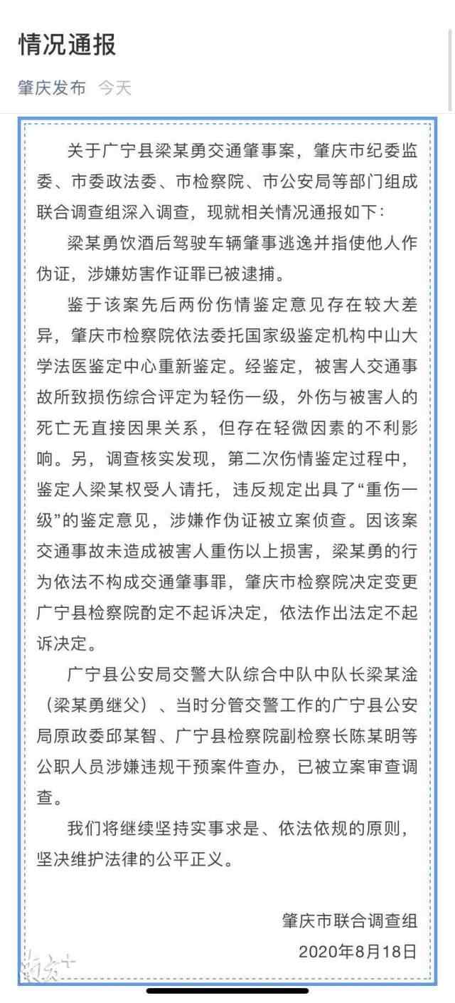 2020年8月18日,肇庆市联合调查组通报了广宁县梁某勇交通肇事案调查情况,国家级鉴定机构中山大学法医鉴定中心对被害人程某群出具“轻伤一级”的伤情鉴定意见。