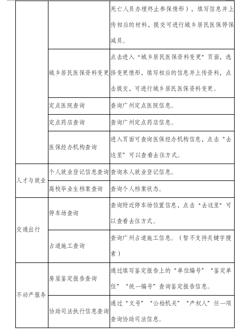 在社保服务版块,市民绑定个人社保卡后,可查询个人社保信息,社保缴费明细,进行社保卡申领、挂失、换卡、补卡等操作,同时,也可查询社保经办机构;在医保服务版块,市民可进行医保停保减员、资料变更,查询定点医院、药店、医保经办机构等信息;在人才与就业服务版块,市民可查询个人就业登记信息、高校毕业生档案信息;在交通出行服务版块,可查询停车场及占道施工信息;在不动产服务版块可查询房屋鉴定报告、协助司法执行信息等。