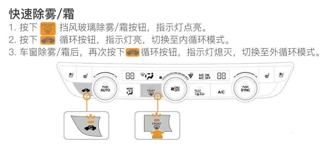 利用空调除雾才是正确方法,对于有自动空调的车型,它的说明书是这样的——