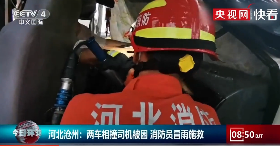 河北沧州两车相撞司机被困 消防员冒雨施救