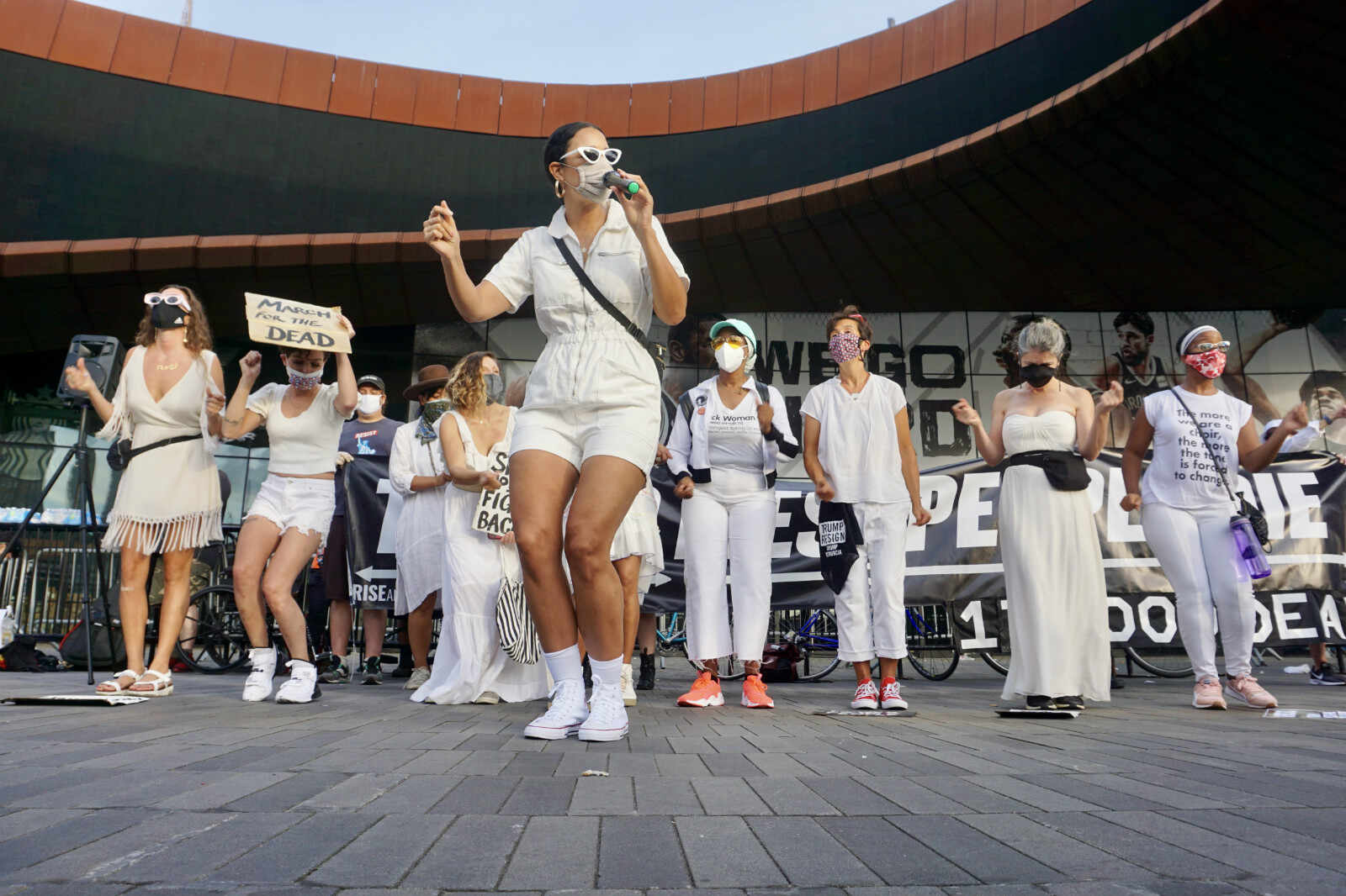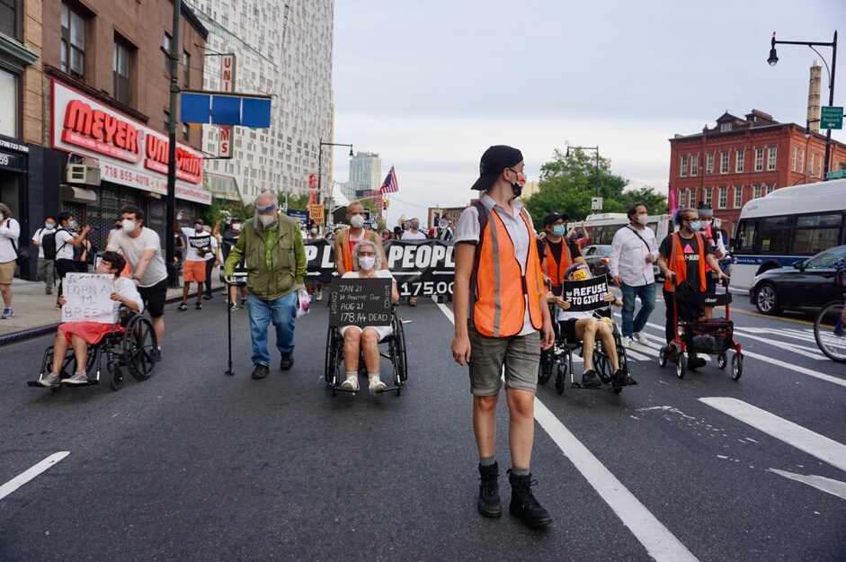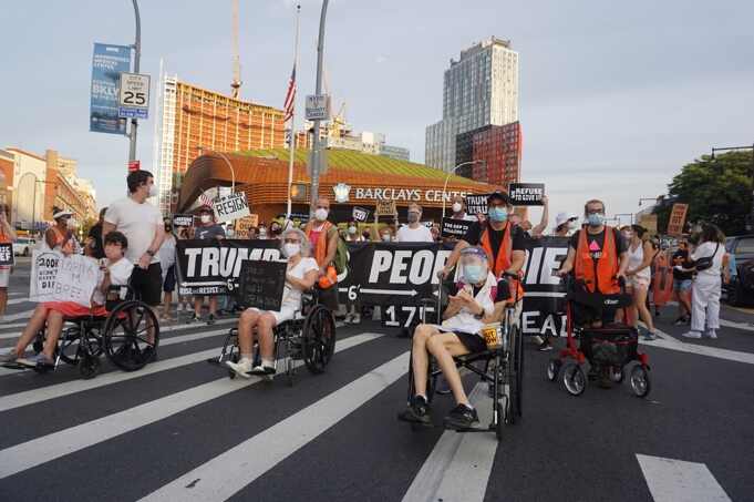 在布鲁克林的巴克莱中心前,数百名抗议者逐渐聚集起来。这些抗议者都穿着白色的衣服,他们当中很多人的亲人和朋友在这场疫情中过世。根据组织者的要求,所有人几乎都佩戴了口罩,展现他们对科学的尊重。