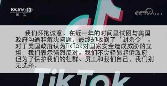 “我们怀抱诚意、在近一年的时间里试图与美国政府沟通和解决问题,最终却收到了‘封杀令’。对于美国政府认为TikTok对国家安全造成威胁的立场,我们表示强烈反对。我们不会轻易起诉政府,但为了保护我们的社群、员工和我们自己,我们别无选择。”
