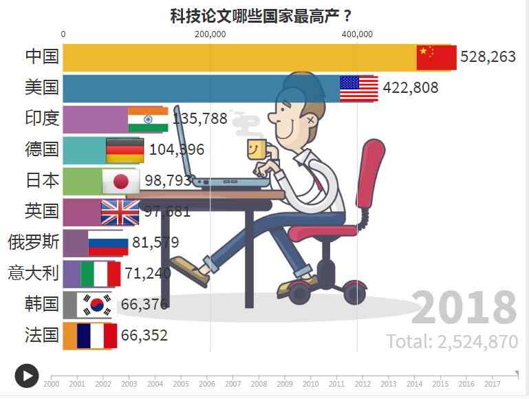 羊城晚报全媒体记者查询世界银行2000年以来的数据发现,中国研究人员在科技期刊出产的论文数量也持续增长,2004年,中国成为第二,并在2016年超越美国,跃居世界第一。(此处所指的科技期刊文章,是指在物理、生物、化学、数学、临床医学、生物医学研究、工程和技术,以及地球和空间科学等领域出版的科学和工程类文章。)