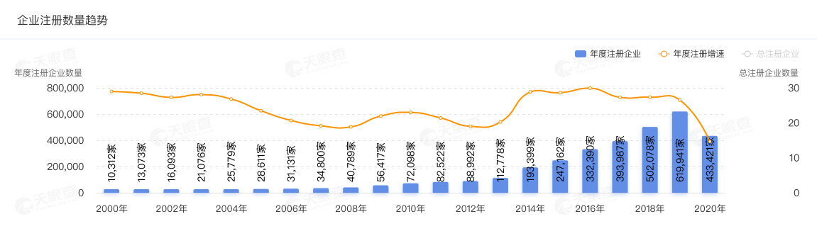 20年来新注册企业几乎每年增两成,科研和技术服务类企业激增63倍