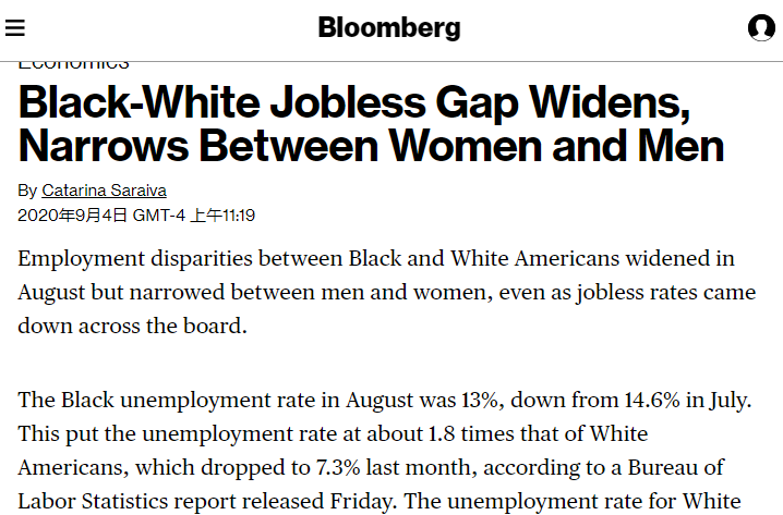 彭博社分析师卡蒂亚·德米特里耶娃表示,黑人和白人的失业率正回到2∶1的比例,因为非洲裔美国人需要更长时间才能重新找到工作,而且他们的就业岗位在经济衰退中受到的影响更大。